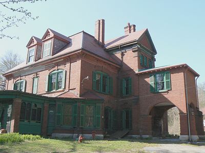 A Propriedade Shepherd Brooks estende-se por 33 hectares com uma mansão de tijolos vermelhos apresentando múltiplas empenas e uma linha complexa de telhado.