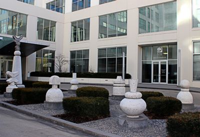 A escultura apresenta seis formas baixas de concreto semelhantes a peças de xadrez, dispostas entre arbustos quadrados perenes nos dois lados.