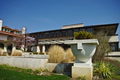 O edifício representa o movimento Prairie School de Frank Lloyd Wright, enfatizando a conexão entre os espaços interiores e o ambiente por meio de seu design.