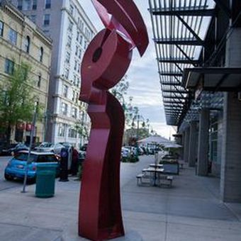 Esta obra contemporânea de Richard Taylor representa a integração da arte pública moderna nos espaços comerciais e sociais de Milwaukee.