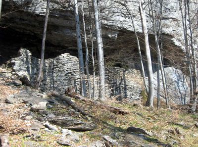 A fortaleza incorpora uma caverna natural como elemento central, visível em como os muros se posicionam sob a parede rochosa. Esta abordagem mostra como os habitantes medievais trabalhavam com a paisagem para proteção.