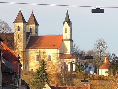 A Dreifaltigkeitskirche fica no topo da colina Dreifaltigkeitsberg e apresenta uma igreja-salão orientada para o oeste com um coro integrado e duas torres flanqueantes em estilo barroco. A estrutura molda o horizonte do Regensburg setentrional com sua forma distintiva visível de múltiplos pontos de vista.