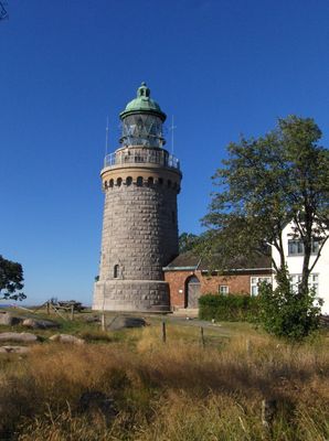 O farol e seus antigos edifícios da equipe representam o patrimônio marítimo na ilha de Bornholm, com as estruturas agora servindo como residências de verão privadas.