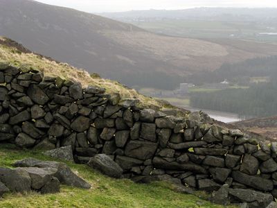 O Muro Mourne estende-se por 35 quilômetros através de quinze picos montanhosos, construído inteiramente com granito local sem argamassa.