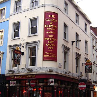 Coach and Horses é um pub histórico na Greek Street com móveis de madeira escura, uma lareira central e design interior tradicional tipico de estabelecimentos londrinos. O prédio preserva adegas abaixo do nível da rua que contem elementos arquitetonicos originais de varios séculos atras.