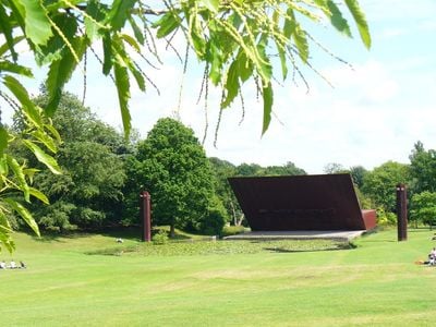 A plataforma inclui espaços para piqueniques e atividades de lazer, com acesso por estações de trem e rotas de ônibus próximas.