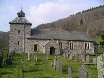 A igreja normanda de pedra está localizada em um cemitério circular cercado por teixos antigos a 197 metros de altitude no Vale de Tanat.