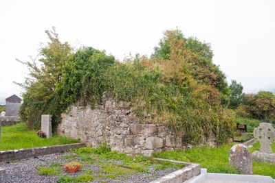 O local monástico está localizado nos terrenos de um antigo asilo próximo a Clonmacnoise, com vestígios visíveis incluindo fundações da igreja e pedras esculpidas.