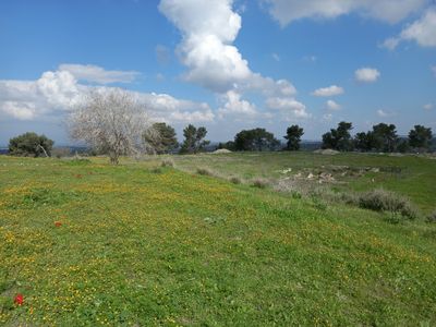 O sítio arqueológico de Azeca alcança 347 metros acima do nível do mar, com vista para o Vale de Elah e planícies costeiras.