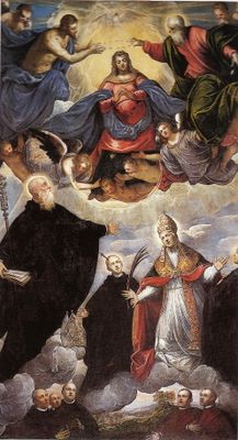 Crowned Madonna between Benedictine Saints, painting by Jacopo Tintoretto in the Basilica of San Giorgio Maggiore