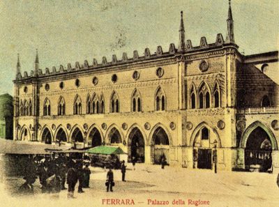 Palazzo della Ragione e um edificio judicial medieval na Piazza Trento e Trieste em Ferrara, apresentando arquitetura gotica com arcos apontados e detalhes de pedra bem definidos. O edificio fica em um cruzamento importante e mostra o estilo caracteristico das estruturas civicas daquele periodo.