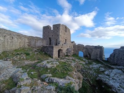 Castello Belvedere é uma fortaleza pentagonal pendurada a 750 metros em um afloramento rochoso, com muros exteriores e uma torre de vigia central dominando o Mar Jônico. A estrutura exibe características defensivas medievais típicas, incluindo frestas para flechas e caminhos de patrulha ao longo das muralhas.
