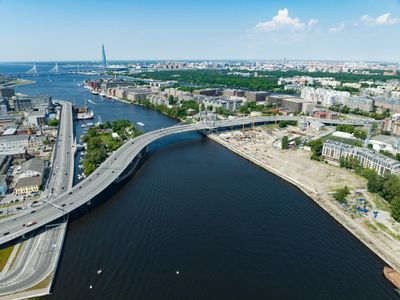 O design em forma de S e sua construção estaiada tornam esta ponte uma adição notável às realizações de engenharia de São Petersburgo.