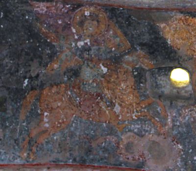 A igreja foi construida entre os seculos 12 e 13 e exibe um afresco em sua parede norte mostrando tres cavaleiros incluindo sao Jorge. Este santuario tornou-se parte de um vasto assentamento que servia como um centro espiritual regional durante o periodo medieval.