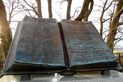 O monumento tem formato de um grande livro de bronze com páginas abertas mostrando listas detalhadas das formações militares.