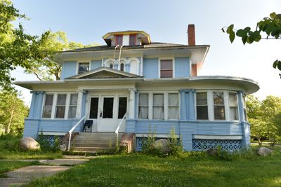 A residência mantém suas características originais do estilo Colonial Revival, incluindo detalhes decorativos na entrada, janelas com múltiplos painéis e materiais tradicionais.