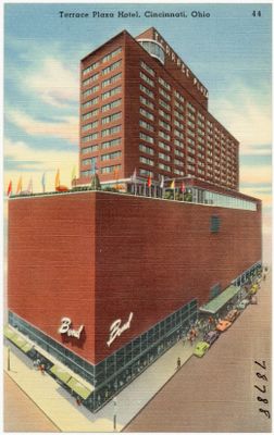 O Hotel Terrace Plaza ergue-se por 18 andares como uma estrutura de estilo internacional com uma fachada distintiva de tijolos no número 15 da West Sixth Street.