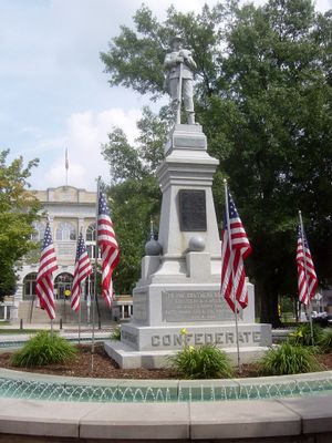 O monumento de granito apresenta uma estátua de soldado confederado de 6,1 metros em posição de descanso sobre um pedestal elevado.
