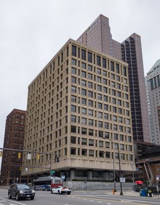 Huntington Plaza e um predio de escritorios em estilo brutalista com 12 andares, exibindo padroes de grelha de concreto e janelas expansivas na fachada, com um saguao de vidro recuado ao nivel da rua. Um espaco verde adjacente em seu lado leste complementa a estrutura e a liga ao maior complexo Huntington Center proximo.