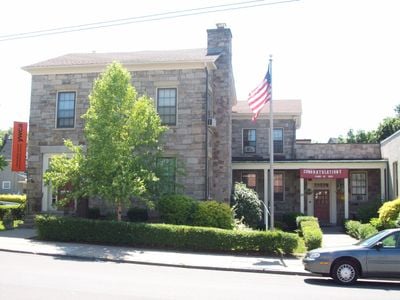 A estrutura de pedra com três módulos no número 32 da Cottage Street apresenta alvenaria de pedra talhada, cornija em estilo federal e retornos no frontão.