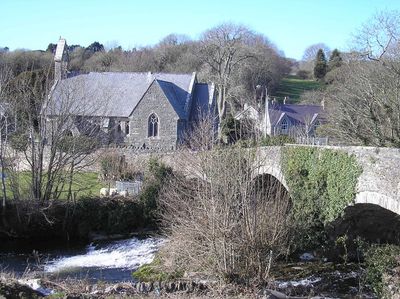 Pont Llanystumdwy, Grade II listed building in Gwynedd. The bridge carries the main street of the village over the Afon Dwyfor