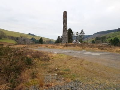 Cwmsymlog Mine chimney, Grade II listed building in Trefeurig. Situated to N of track that continues from metal road E out of Cwmsymlog