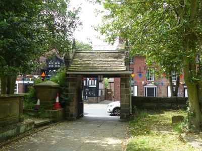 Lychgate and west wall of St Peter's churchyard, lychgate in Prestbury, Cheshire, UK