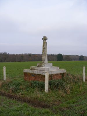 O monumento de pedra e tijolo está localizado em um campo a leste de Abbey Hill, marcando o local tradicional do martírio de São Edmund.