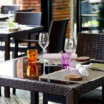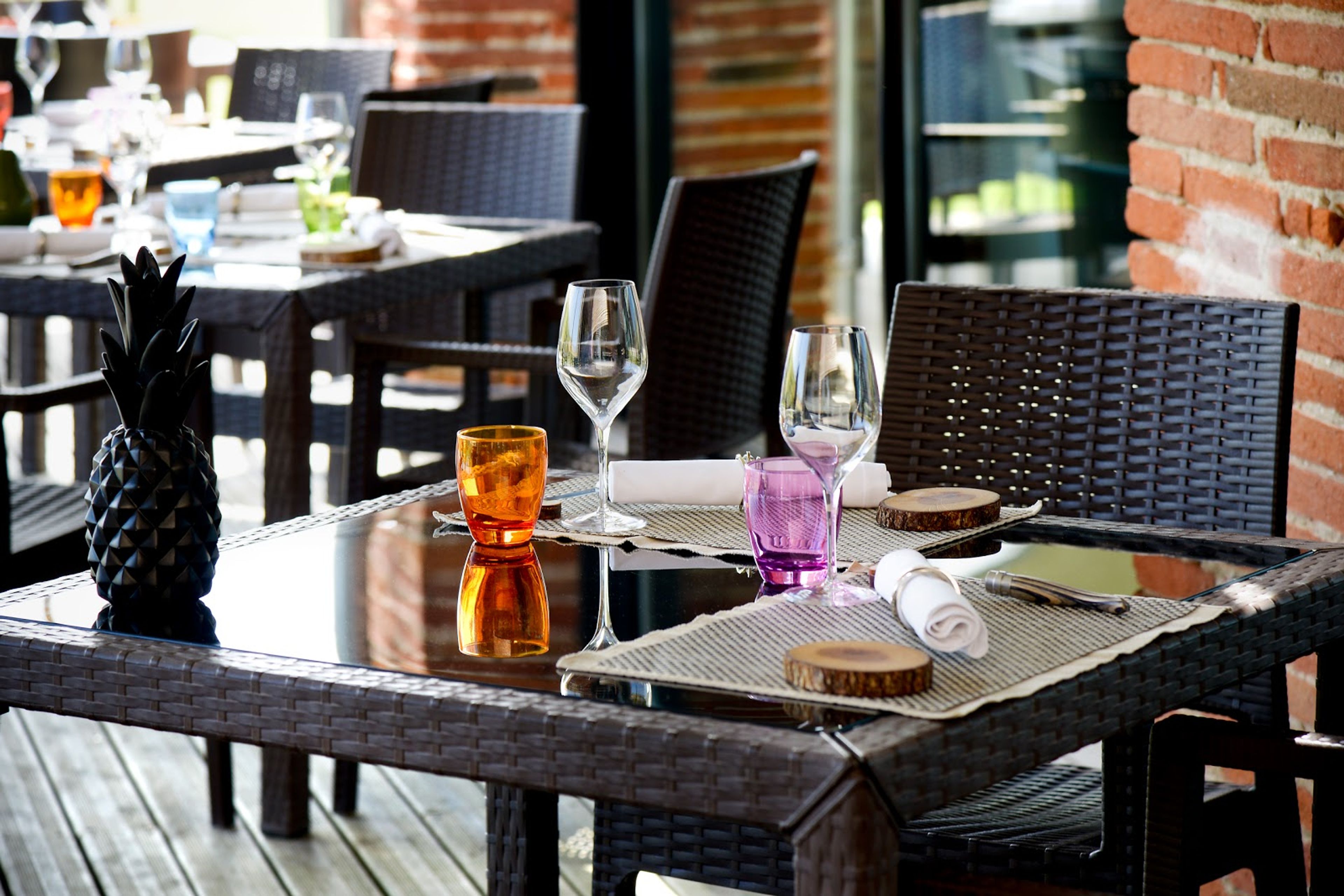 O restaurante incorpora ingredientes de seu jardim, incluindo flores comestíveis e produtos locais de agricultores da região Midi-Pyrénées.