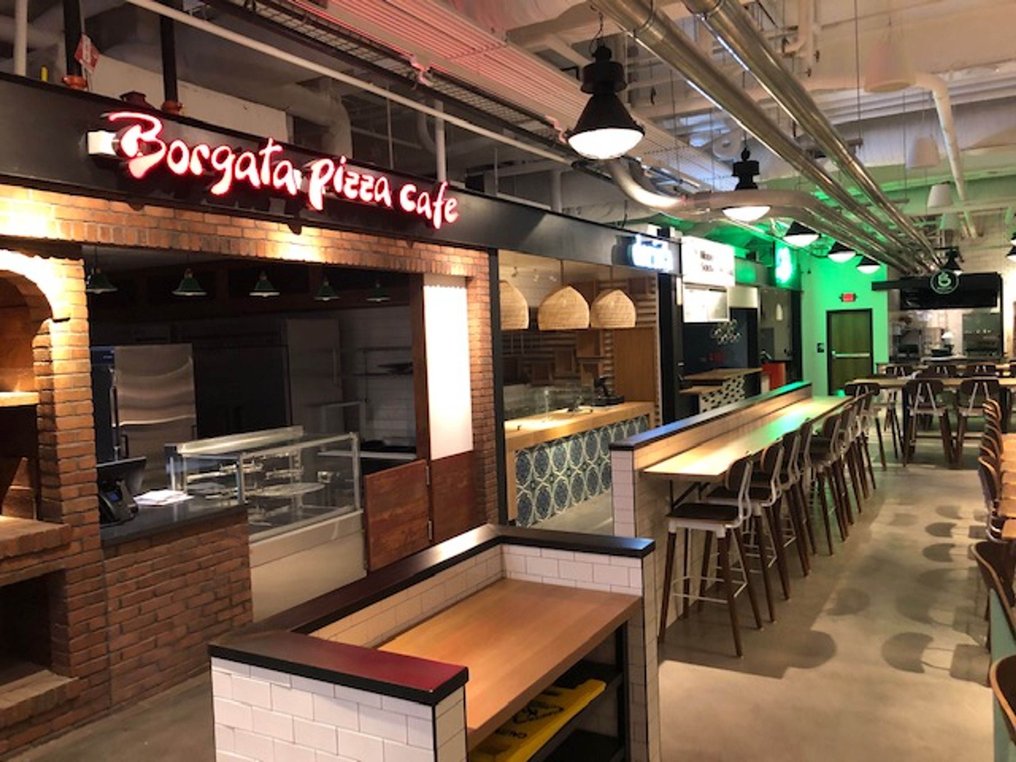 O Budd Dairy Food Hall apresenta nove cozinhas operadas por chefs servindo diferentes culinárias em três níveis, incluindo um bar na cobertura.
