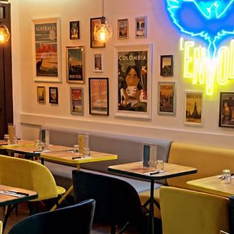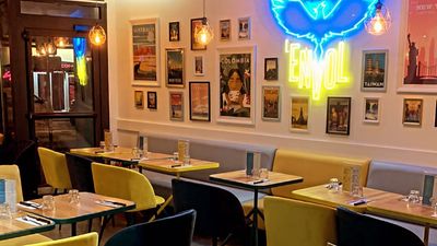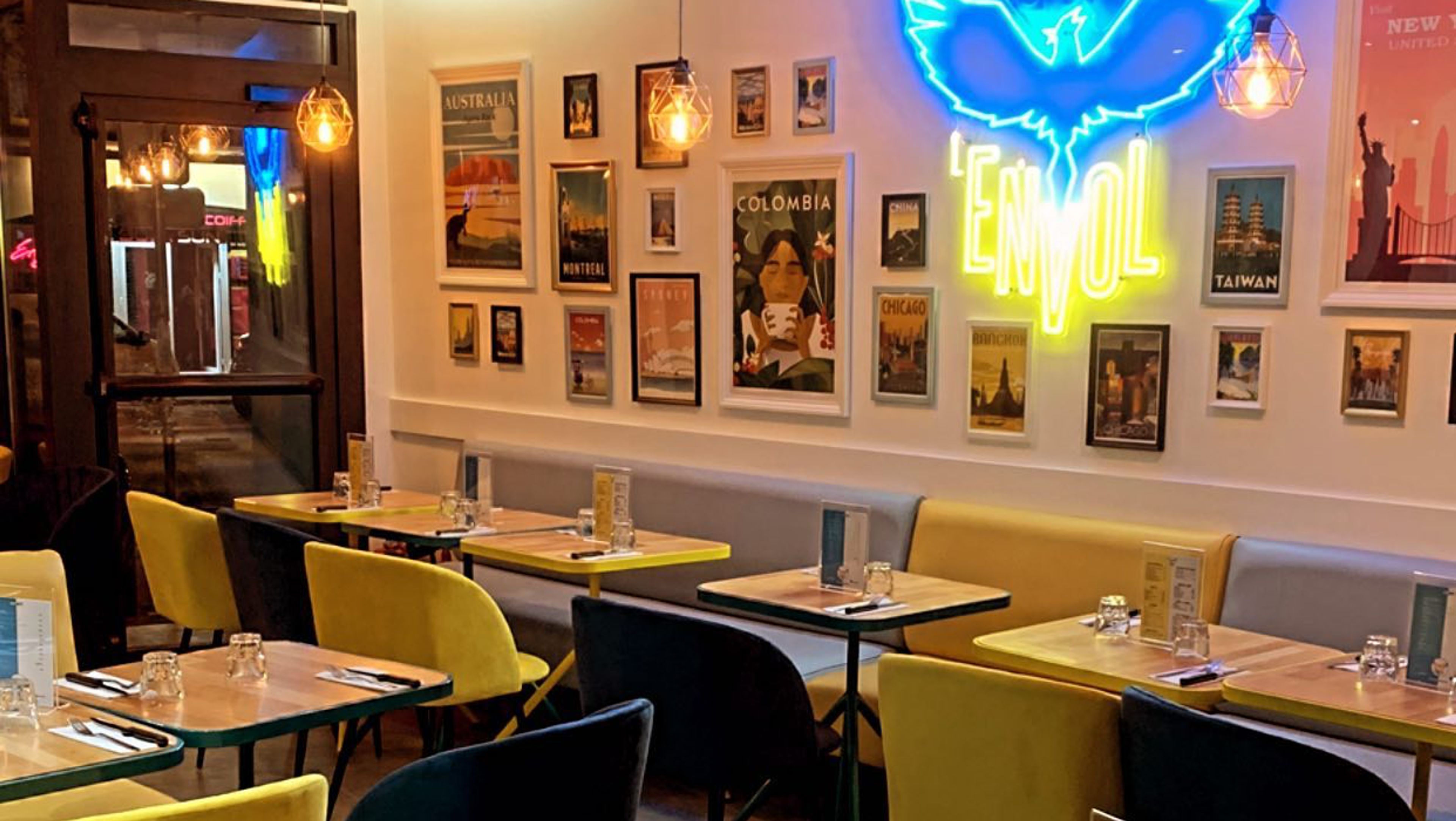 L'Envol apresenta um cardápio de pratos de frango preparados com receitas internacionais, incluindo especialidades da Ásia e África em um interior com plantas.