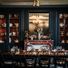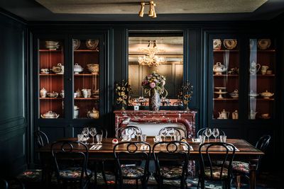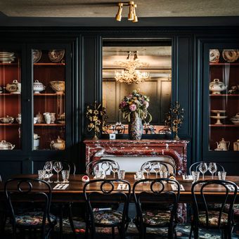 O restaurante apresenta diversos ambientes para refeições, incluindo um salão principal com lareira e lustre Art Déco decorado com folhas de videira.