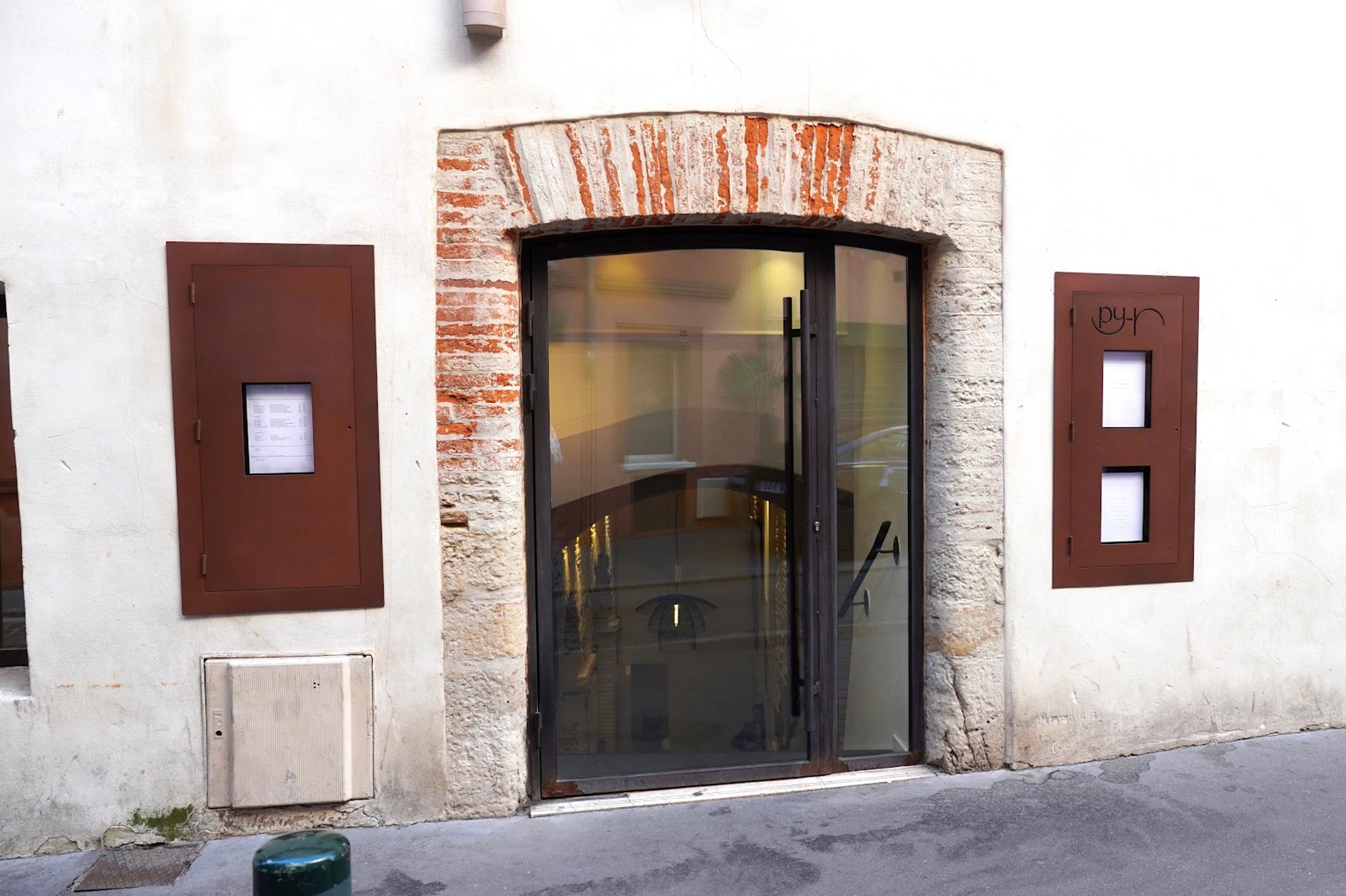 O PY-R está localizado no número 19 da Descente de la Halle-aux-Poissons, com abóbadas brancas e sala de jantar decorada com arte contemporânea.
