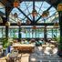 Durante o verão, o teto retrátil abre para criar um terraço ao ar livre, enquanto no inverno as refeições são servidas próximo a uma lareira interna.