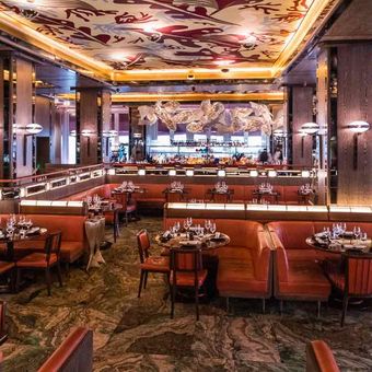 O restaurante apresenta tanques de recifes de coral, decorações elaboradas no teto e obras de arte encomendadas a Frank Gehry e Damien Hirst.