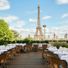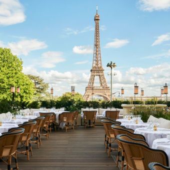 Do terraco, os comensais podem observar o espetaculo de iluminacao noturna da Torre Eiffel, que fica mais impressionante apos o por do sol. Esta vista da Place du Trocadero e um dos locais mais procurados em Paris para experimentar este espetaculo noturno.