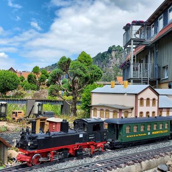 Eisenbahnwelten é um grande modelo ferroviário cobrindo mais de 7500 metros quadrados com aproximadamente 5200 metros de trilhos onde trens circulam regularmente em escala 1:22,5. A exposição recria linhas ferroviárias da região, incluindo rotas famosas como a Ferrovia de Semmering e o Bonde de Kirnitzschtal, com paisagens detalhadas, edifícios e pontes.
