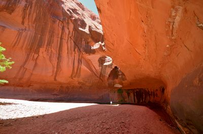A Catedral Dourada apresenta três pontes naturais que criam aberturas no teto rochoso, permitindo que a luz solar ilumine as paredes de arenito laranja.