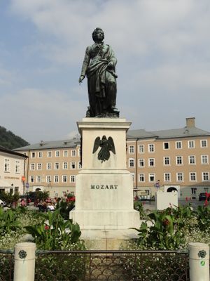 O monumento a Mozart em Salzburgo é uma escultura em bronze que representa o compositor em traje de época, colocada em uma base de mármore decorada com figuras musicais e alegóricas. A estátua fica no centro da Mozartplatz, cercada por edifícios históricos.