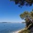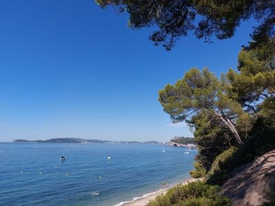 Da praia, observam-se os navios entrando no porto de Toulon enquanto a península de Saint-Mandrier cria uma barreira natural.
