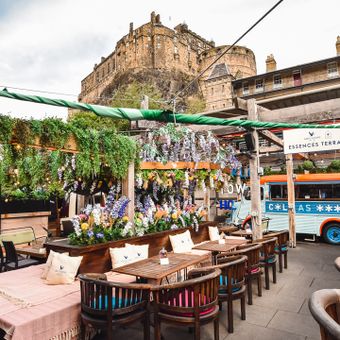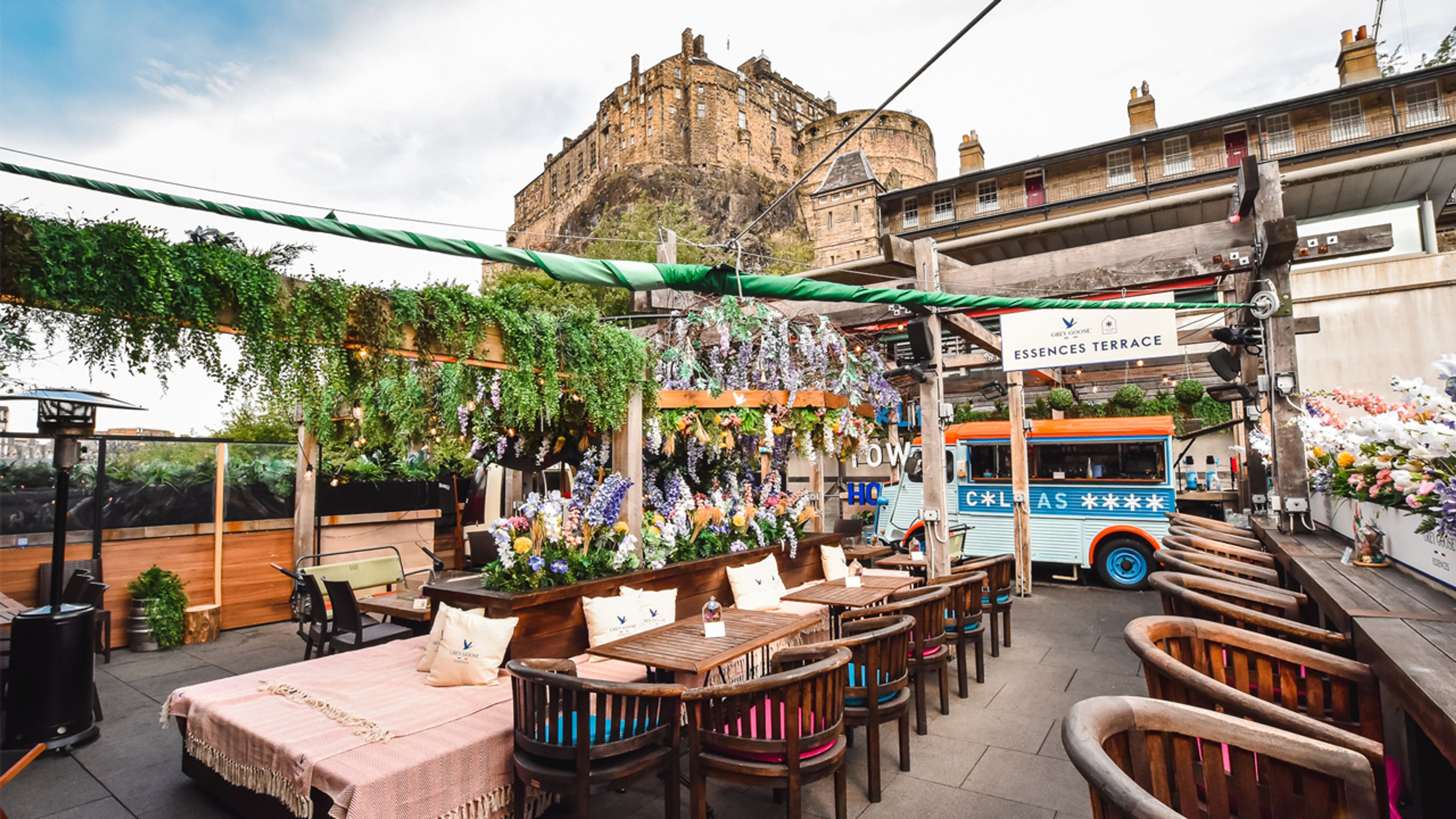 O terraço no telhado apresenta bebidas servidas de veículos vintage incluindo uma van Nissan, complementado por cobertores aconchegantes e arranjos de assentos que proporcionam vistas deslumbrantes do Castelo de Edimburgo.