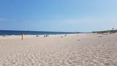 A praia ocidental se estende ao longo da costa do Mar Báltico com areia branca e múltiplos pontos de acesso para visitantes.