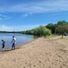 A praia sudeste do lago Harriet estende-se ao longo da margem oriental com área de natação arenosa e zonas de pesca próximas a uma trilha pavimentada.