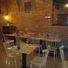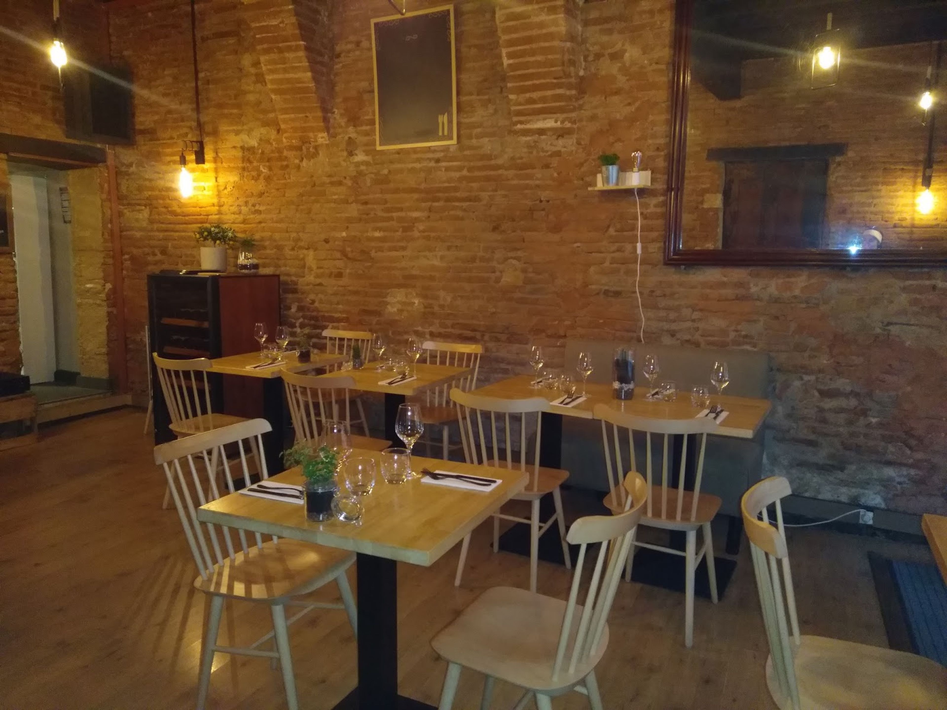 O salão apresenta paredes de tijolos rosa expostos e elementos em madeira, criando um ambiente equilibrado em um edifício tradicional tolosano.