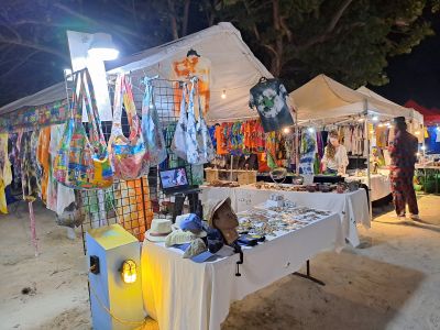 O Mercado de Peixes Berinda Cox apresenta várias bancas exibindo pescados frescos do Mar do Caribe, incluindo marlim, atum e peixe voador.
