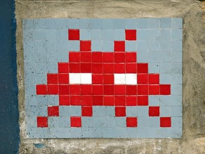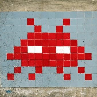 Este mosaico do Invader mostra uma figura vermelha de alienígena com dois olhos brancos, feita de azulejos quadrados sobre fundo azul. O formato é retangular e as cores e linhas são simples.