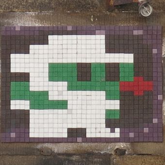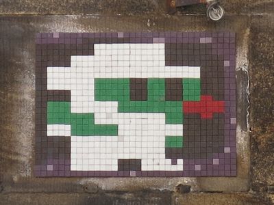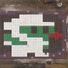 O mosaico mostra um personagem quadrado feito com peças brancas, verdes e pretas, com um retângulo vermelho parecido com uma língua ou raio. O fundo é roxo escuro, parecendo a cabeça de uma criatura ou robô com grandes olhos verdes em pixel.
