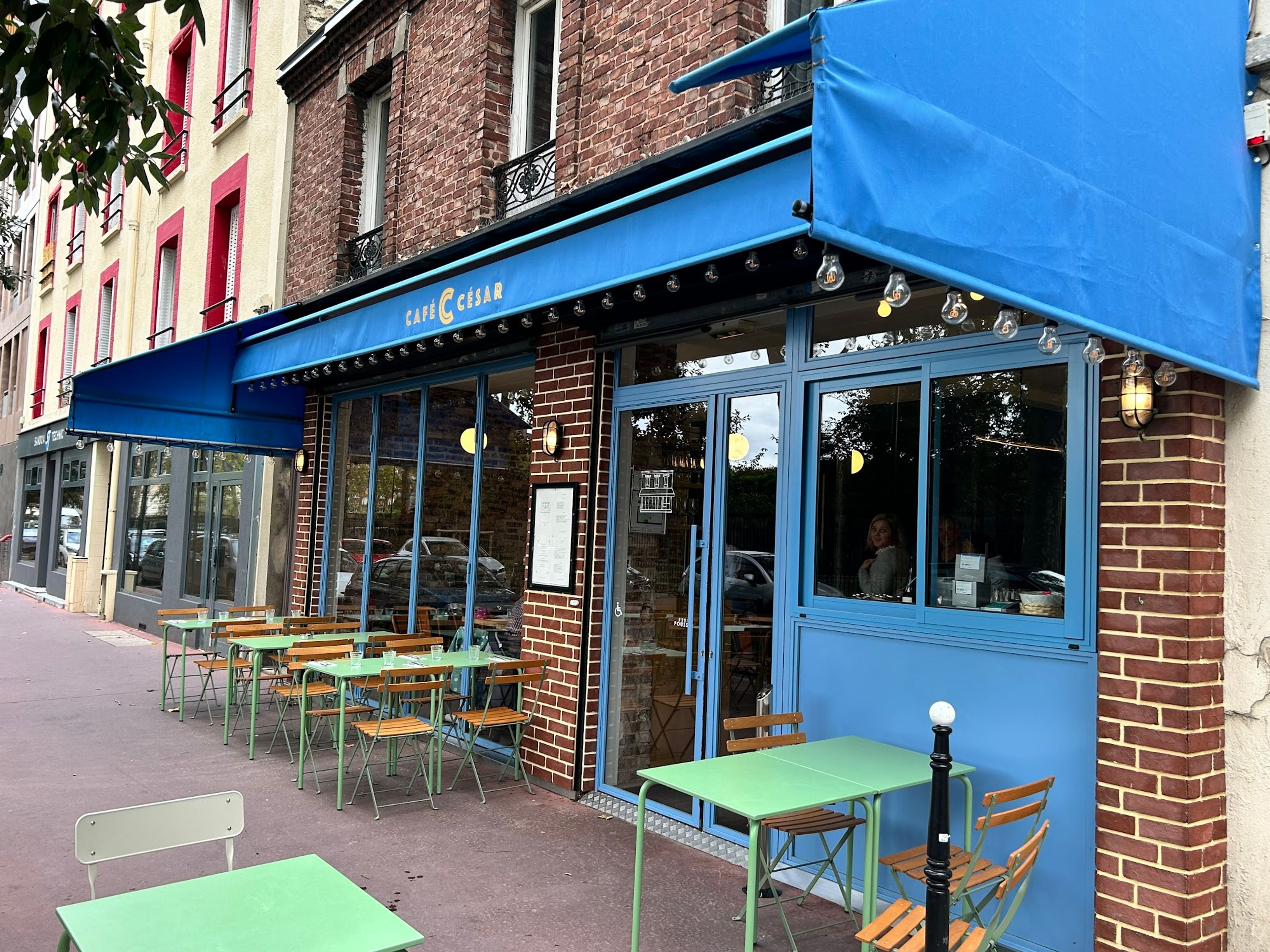 O Café César apresenta janelas do chão ao teto e um balcão com azulejos azuis mediterrâneos, criando um espaço luminoso onde os hóspedes podem desfrutar de culinária francesa sazonal preparada com técnicas culinárias modernas e ingredientes frescos.