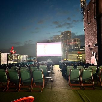 Rooftop Film Club é um cinema ao ar livre em um telhado em Stratford, Londres, que exibe filmes em uma grande tela acima da cidade. O local oferece assentos confortáveis com vista para a tela contra o céu da noite, e mostra uma mistura de filmes clássicos e recentes.