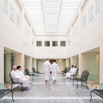 As termas foram fundadas no século 19 quando se descobriram as propriedades curativas das fontes minerais locais. O edifício de 1937 em estilo Art Déco mostra como o local evoluiu de estação termal para destino wellness moderno.